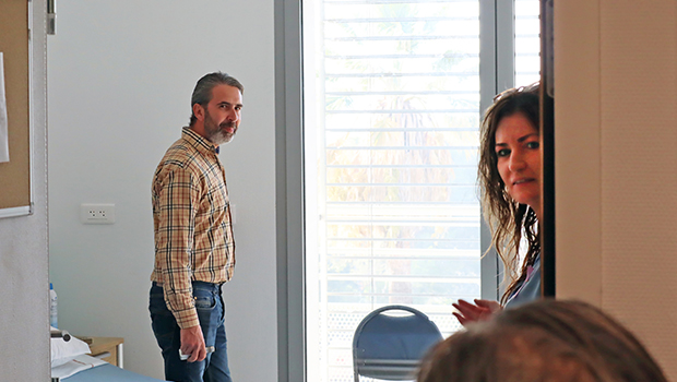 Thierry (en second plan), accompagné par l’association, dans sa chambre de l’hôpital. Au premier plan, Christelle Le Guen, cadre de santé chez Promo Soins UDV Toulon Métropole.