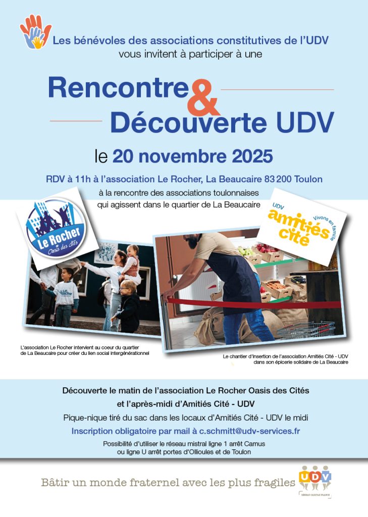 Les bénévoles des associations constitutives de l’UDV vous invitent à participer à la prochaine Rencontre & Découverte UDV le jeudi 20 novembre à Toulon à la rencontre des associations toulonnaises qui agissent dans le quartier de La Beaucaire.