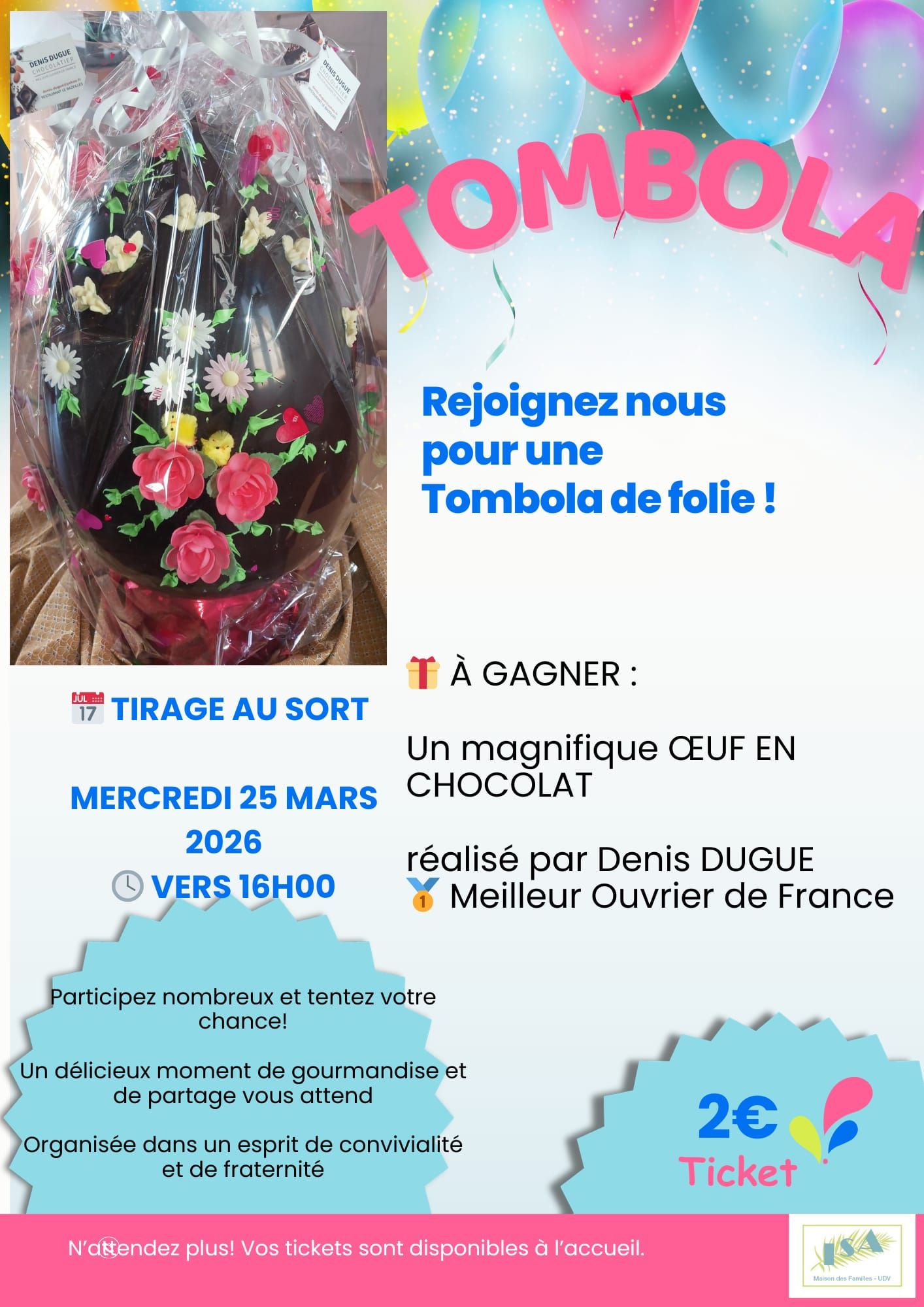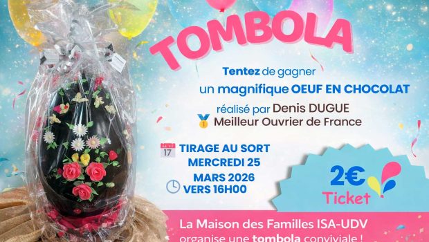La Maison des Familles ISA-UDV organise une grande tombola placée sous le signe de la convivialité et du partage. À la clé : un magnifique œuf en chocolat réalisé par Denis Dugue, Meilleur Ouvrier de France.